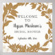 Présenté comme un panneau de bienvenue pour une douche de mariée, chaque ligne peut être personnalisée pour votre événement spécial. Quelques brins de feuilles et de fleurs esquissés au crayon ont été dessinés à la main et sont combinés avec du feuillage de forêt imprimé en bloc, rassemblé dans une couronne lâche dans des nuances d'or d'automne et de rouille. La décoration de fête en papier et les invitations pour correspondre sont disponibles dans cette collection. Droit d'auteur artistique, Audrey Jeanne Roberts.