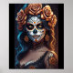 Découvrez l'attrait du maquillage du crâne au sucre avec cette image captivante. Gros plan d'une femme ornée de maquillage crâne à sucre, avec des motifs complexes et une palette de couleurs vibrantes, symbolisant un mélange d'héritage culturel et de tendances de beauté contemporaines.