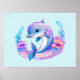 Poster avec une adorable illustration. Un dauphin bleu et violet entouré de jolies fleurs sous-marines colorées.