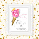 Cette douche nuptiale à thème crème glacée est décorée de fleurs d'aquarelle et d'un cône de crème glacée. Le texte dit "Elle a été scoopée !" dans la typographie stylée rose.