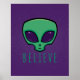 Illustration de la tête de l'alien de dessin avec de grands yeux foncés avec des lettres "Croire".