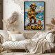 Ce tableau de charme représente un ours habillé comme pompier, portant lunettes de soleil et casque, montant une guitare acoustique, perché sur une falaise rocheuse surplombant un océan vibrant et ondulé. Un pot de miel doré est placé à côté. La toile de fond est un ciel bleu avec des nuages moelleux. Les coups de pinceau épais et texturés rehaussent la nature capricieuse et douce de la scène, avec "Love My Honey" en évidence.
