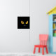 Un chat noir à l'air mignon et espiègle avec de grands yeux jaunes oranges en amande et de mignons petits crocs blancs se mêlant à un arrière - plan noir.