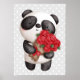 Une affiche avec un adorable dessin aquarelle. Un adorable ours de panda noir et blanc portant un bouquet de roses. Gris avec arrière - plan pois blanc.