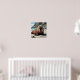 Walrus themed wall art with a cute walrus laying on a sandy beach by the ocean on a sunny day. Background of cliffs and blue ocean waves.
