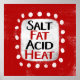 "Salt Fat Acid Heat" est un design de texte amusant avec une forme d'accent blanc entourée de points blancs texturés.