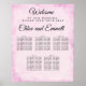 Aquarelle rose pâle, tableau de sièges Mariage à 5 tables. Bienvenue et les noms des couples mariages sont écrits dans une police de caractères élégante et classique. Tout le texte peut être modifié. L'arrière - plan de lavage à l'aquarelle rose rousse a un bord subtil pour définir votre signe.