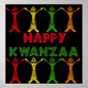 Quatre danseurs en rouge, bleu, vert et jaune dansent entre les mots "Happy Kwanzaa" pour aider à célébrer le sens de la communauté, de la famille et des nouveaux débuts de l'année à venir.