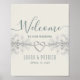 Elégant script de calligraphie manuscrite moderne sauge vert mariage bienvenue affiche avec simple coeur de corde argentée et vintage dentelle dorée fleurie.