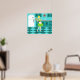 Avec cette affiche de cuisine rétro, vous pouvez avoir votre tarte et le manger, aussi. Ce dessin d'art kitsch et minimaliste présente une femme au foyer des années 50, dans sa cuisine moderne du milieu du siècle. Le beau boulanger porte une robe verte et bondissante et un tablier blanc aux détails rouges. Pas un cheveu sur sa tête blonde n'est déplacé. D'une part, elle tient le fruit de son travail, une magnifique tarte aux fruits surmontée d'un treillis. Un coup d'oeil et vous saurez que ses croûtes de tarte grinçantes sont sans égal. Elle est debout sur un aqua et un damier turquoise, qui est sans aucun doute assez propre pour se nourrir de. Contre un mur d'aqua, on voit une cabane turquoise avec des garnitures d'aqua, un plan rouge, des tiroirs rouges et des accents d'starburst noir. Une horloge rouge d'étoile est suspendue au mur. Sur le côté, on trouve un frigo blanc dernier cri avec poignées en argent. Au moins, le réfrigérateur était à la pointe de la technologie dans les années 1950. Maintenant, c'est juste du rêve ! Que vous soyez Suzie Homemaker ou que vous ayez simplement une affinité pour tout ce qui est vintage, vous êtes sûr d'aimer cette tranche délicieuse d'Americana.