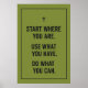 Inspirer votre espace avec cette affiche de motivation élégante avec la citation : "Commencez où vous êtes. Utilisez ce que vous avez. Faites ce que vous pouvez." Parfait pour les bureaux, les salles d'études ou comme un cadeau réfléchi.