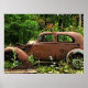 Ce poster d'art met en scène une vieille dallée pauvre laissée rouille dans les bois. Il est entouré d'arbres verts et de fleurs sauvages blancs. Cette vieille voiture rouillée orange, brune et bleue possède une certaine beauté et une certaine dignité.
