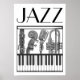 Poster de musique de jazz noir et blanc. L'oeuvre originale a été réalisée au charbon de bois. Design possède une variété d'instruments de musique dont une clarinette, une basse debout, un vieux microphone, une trompette, un piano et un batteur. Idéal pour l'amateur de musique, l'enseignant ou l'étudiant.