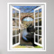 Belle vue panoramique de pont rustique avec rivière coulante et ciel bleu. Image de l'ancienne vue de pont par la fenêtre sur l'impression personnalisée d'affiche.