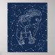 Imaginaire graphique blanc linéaire illustration du signe du zodiaque Libra sur un arrière - plan bleu marine. Le tableau représente une fille parmi les constellations célestes, sur son cou un collier à écailles, sur lequel sur un bol est un coeur, et sur l'autre - un crâne.