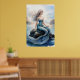 Poster d'une sirène sereine aux cheveux longs qui coule gracieusement sur un rocher entouré d'eaux océaniques calmes et de falaises lointaines. Des couleurs douces et pastel rehaussent l'atmosphère paisible et magique de la scène.