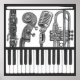 Poster avec un thème jazzy. Dessin fait au charbon de bois. Conception faite avec des parties de clarinette, basse droite, microphone à l'ancienne, trompette, piano et tambour.