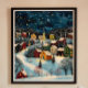 Hiver Nuit Folk Art Huile Peinture Poster Cette peinture à l'huile d'art populaire capture la beauté enchanteresse d'un village enneigé sous un ciel étoilé bleu foncé. La scène est vivante avec des couleurs vives, contrastant les teintes profondes de la nuit avec les maisons colorées recouvertes de neige. Les étoiles scintillantes ci-dessus apportent une touche magique qui illumine le paysage serein et tranquille. Ce tableau apporte chaleur et charme à tout espace, évoquant le calme et l'émerveillement d'une nuit d'hiver dans un village pittoresque et pittoresque. Parfait pour ajouter une atmosphère cosy et nostalgique à votre décor maison.