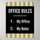 Poster humoristique noir et or "Office Rules". Vous pouvez customiser cette affiche drôle en changeant la couleur de l'arrière - plan et en ajoutant votre texte pour qu'il dise tout ce que vous voulez. Ça a l'air super avec un cadre noir !