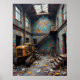 Cette peinture capture l'intérieur atmosphérique d'un entrepôt industriel abandonné. L'espace est vaste, plein de décomposition, avec un haut plafond et des murs peints et multicolores. Le sol est parsemé de gravats et de débris colorés, et des machines lourdes et rouillées sont inactives, un témoignage de son ancienne fonction. L'oeuvre utilise une texture riche et peinte pour mettre en valeur la légèreté et la complexité visuelle de la scène.