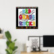 Farbenfroher und lustiger schwarzer Hintergrund mit bunten Designkanten, musikalischen Noten und mehrfarbigem Text, der "3. Klasse Rocks" auf Plakaten der 3. Klasse liest, den der Lehrer Liebe bekommt!