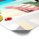 Poster vom tropischen Strand. Strandlandschaft mit Strandhaus und Veranda mit Blick auf den Strand mit Blume, Katze, Schaukelstuhl, Liegestühle, Palmen, Segelboot und Kolibri.