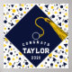 Affiche créative de remise de diplômes avec casquette bleu marine avec goût or sur arrière - plan confetti. Pour personnaliser, modifier le texte ajouter son nom et son année de classe supérieure.