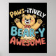 Cette illustration joyeuse présente un adorable ours caricatural brun clair avec ses bras levés dans un geste enthousiaste. L'ours porte une petite cravate d'arc rouge et a des joues roses. Au-dessus de l'ours, le texte ludique "PAWS-ITIVELY" est écrit dans une police blanche fantaisiste. Sous l'ours, "BEAR-Y" est rendu en bleu clair et "AWESOME" en orange vif, le tout dans un style amical et arrondi. Le design exhale la positivité, la gentillesse et le sens de l'enthousiasme ludique, ce qui le rend "pitoyable".