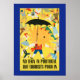 Une belle image d'une affiche touristique pour le Portugal. L'affiche représente un homme tenant un parapluie avec des gens colorés qui pleuvent d'en haut. Cette affiche serait parfaite dans n'importe quelle pièce.