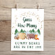 Sympathique signe de jeu pour votre baby shower avec "Devinez combien d'ours de gomme sont dans le pot" écrit dans la typographie rustique et un script vert de forêt et une aquarelle illustration des animaux des bois avec leur tente campant dans les montagnes et la forêt sous un ciel d'étoiles d'or. Placez un bocal ou une bouteille remplie d'ours rouges en dessous et demandez à vos invités de deviner combien sont dans le bocal. Le gagnant sera l'invité qui se rapproche le plus sans passer par là. Les cartes de devis correspondantes sont disponibles dans notre collection de Baby showers Adventure Awaits Woodland Animals.