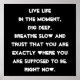 Poster de citation motivationnelle en noir et blanc ...vivez la vie dans le moment.Creusez profondément, respirez lentement et faites confiance à ce que vous êtes exactement là où vous êtes censé être en ce moment. Inspirationnel, encourageant et affirmant.