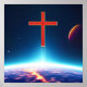 Croix rouge et or près des planètes s'échappent de l'espace. Créé à l'aide d'un logiciel AI.