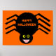 Cette impression d'Halloween présente une araignée noire éffrayante avec huit pattes poilues, des yeux jaunes avec de grands élèves noirs et sa bouche ouverte montrant ses crocs. L'arrière - plan est orange et la bordure noire. Il y a du texte orange sur le dos de l'araignée qui dit "Happy Halloween".