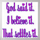 Les lettres violettes lisent : "Dieu l'a dit. Je le crois. Ça règle." Les coeurs pointent les i. Une façon amusante de montrer votre amour de votre religion et votre foi en Dieu. Grand don pour les mariages, les ordinations, les baptêmes, les premières communions, les confirmations, et tout jour saint. Merveilleux pour Noël, Pâques et anniversaires aussi.