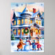 Une maison victorienne enneigée avec des lumières chaudes qui brillent à l'intérieur, une couronne sur la porte, et des enfants qui jouent à l'extérieur.