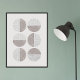 Cet imprimé d'art moderne comporte une série de cercles divisés en deux, et divisés en lignes courbes et droites. La moitié solide de chaque cercle est d'une couleur gris vif, tandis que l'autre moitié est pressée en feuille d'or ou d'argent. Ce design est assez polyvalent pour fonctionner avec une variété de styles de décoration, mais je pense qu'il aurait l'air génial dans un bureau ou un loft.