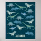 Beaucoup de dinosaures bleus, Tyrannosaurus rex, Spinosaurus, Stegosaurus, Diplodocus et Tricératops sur un arrière - plan vert turquoise foncé. Modifiez le nom pour personnaliser.