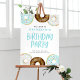 Bienvenue aux invités à votre événement avec ce signe de bienvenue personnalisable fête d'anniversaire. Il présente des beignets bleu, blanc et chocolat avec des arrosages colorés. Personnalisez ceci en ajoutant vos propres détails. Ce signe d'anniversaire de beigne est disponible en d'autres couleurs.