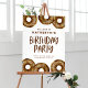 Bienvenue aux invités à votre événement avec ce signe de bienvenue personnalisable fête d'anniversaire. Il comprend des beignets émaillés de chocolat à l'aquarelle avec des arrosages colorés. Personnalisez ceci en ajoutant vos détails. Ce signe d'anniversaire de beigne est disponible en d'autres couleurs.