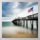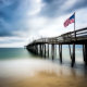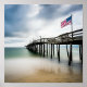 America Le drapeau sur une jetée sereine s'étend dans des eaux calmes sous un ciel nuageux.