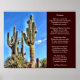 Ce poème primé sur le Saguaro Cactus dans le désert de l'Arizona a été écrit par Rebecca Schverak, une étudiante de 8ème année du collège, et a été interprété lors d'un concours de poésie cowboy en 2013 à Sierra Vista, en Arizona. Le poème est exposé à côté d'une belle photo paysage du sud-ouest du désert avec des cactus saguaro contre un ciel bleu vif.