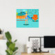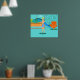 Chaque jour peut être une journée à la plage avec cette Poster Retro Surfer Dude. Le style des années 1960, minimaliste design d'art, est doté d'un mec surfeur baisé au soleil, blond et prêt à attraper une vague. Notre surfeur en forme regarde l'océan à travers les portes coulissantes en verre de sa maison en bord de plage. Il se tient dans son salon couleur aqua. Nous pouvons voir un aqua et turquoise, mur en pierre et fauteuil orange moderne du milieu du siècle. De l'autre côté de la porte vitrée, on aperçoit un patio. Au-delà se trouve une plage de sable doré, un palmier balançant, un océan bleu paon étincelant et un ciel d'aqua. Au loin, on peut voir une île volcanique turquoise, qui est dormante pour le moment. Surfer Dude tient une planche de surf bleue et porte des shorts de planche à motifs de tiki bleu. Attrapez quelques vagues et partagez un peu d'amour avec ce design d'été kitsch!