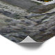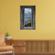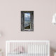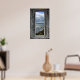 Cette affiche qui ressemble à une fenêtre a une pierre entourée de siècles qui vous fera croire que vous êtes dans un authentique château médiéval. Au-delà de la fenêtre en pierre patinée se trouve une scène de l'océan qui se brise contre le rivage, avec des gorges au premier plan et des collines au loin. Des nuages s'amoncellent dans un ciel bleu au-dessus de la mer.