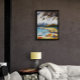 A seascape with a beach area in the foreground, calm turquoise water, and a range of mountains in the background. The sky is dynamic, with dark, heavy clouds contrasting with bright white and yellow accents, adding a sense of movement and drama to the serene landscape below.