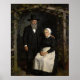 An elderly couple poses in a somber, formal setting under a vine-covered trellis. The man stands while the woman sits, both wearing dark, modest clothing typical of older traditions.