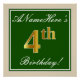 Cette affiche simple et élégante de fête d’anniversaire comporte un message personnalisé comme "AnameHere’s 4th Birthday!" (avec le "4th" à l’allure fausse/imitation dorée) dans une zone de carré de couleur verte avec un contour de bordure simple. Le nom est dans un élégant texte blanc de couleur script, et peut être customisé. Une affiche de fête d'anniversaire personnalisée comme celle-ci pourrait peut-être servir de décoration à une fête organisée pour quelqu'un qui célèbre son quatrième anniversaire. [~Z0000235]