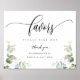 Symbole de mariage élégant avec des détails de verdure d'aquarelle et de calligraphie manuscrite moderne. Eucalyptus feuilles verdoyants dans un beau mélange de tons vert, bleu et beige. 10" x 8" est seulement notre taille par défaut, signe disponible dans une variété de tailles. Facile à encadrer ou alternativement colle/agrafage dans MDF peu coûteux. Concevez une partie de notre collection "Elegant Greenery Eucalyptus Mariage and Events" avec une variété de produits de coordination disponibles.