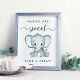 Sympathique signe pour votre bébé garçon douche avec "Babies Are Sweet, Take A Treat" écrit dans un mélange de simple typographie gris doux et un script élégant avec des swashes et une aquarelle bleu pastel d'un bébé éléphant.