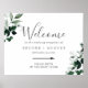 Cette affiche d'accueil mariage de verdure émeraude est parfaite pour un mariage boho. Le design élégant et rustique présente des feuilles d'aquarelle vert foncé moody et des eucalyptus aux tons bohèmes modernes. Customisez l'affiche avec le nom de la mariée et du marié, et la date du mariage.