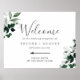 Cette affiche d'accueil mariage direction verdoyante émeraude est parfaite pour un mariage boho. Le design élégant et rustique présente des feuilles d'aquarelle vert foncé moody et des eucalyptus aux tons bohèmes modernes. Customisez l'affiche avec le nom de la mariée et du marié, et la date du mariage.